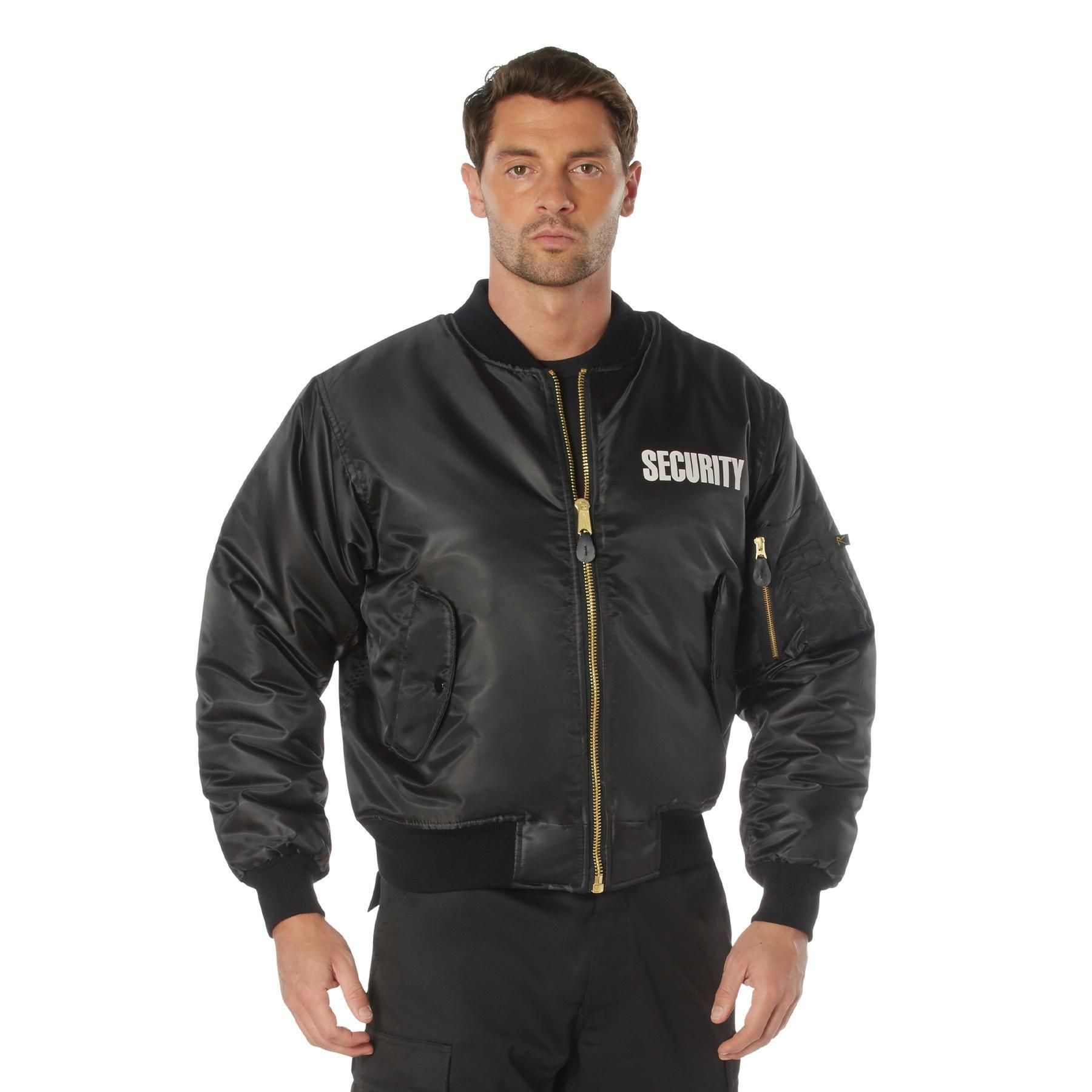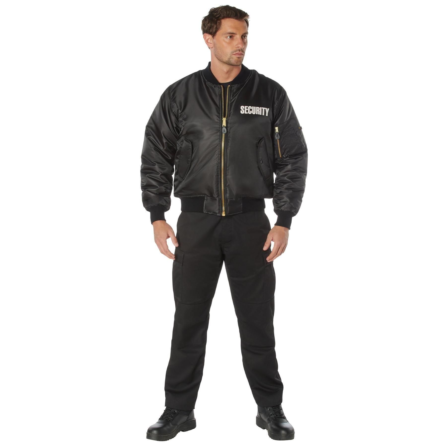 RothcoのセキュリティMA-1フライトジャケットは、ジャケットの左前胸と背面に白い文字で「Security」という用語がプリントされています。